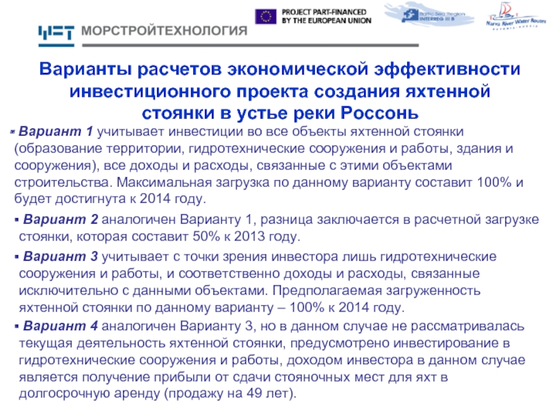 Вариант 3 учитывает с точки зрения инвестора лишь гидротехнические сооружения и работы, и соответственно доходы и расходы, связанные исключительно с данными объектами. Предполагаемая загруженность яхтенной стоянки по данному варианту – 100% к 2014 году.