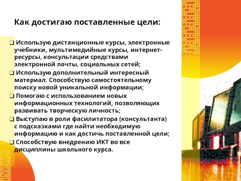 Способствую внедрению ИКТ во все дисциплины школьного курса.