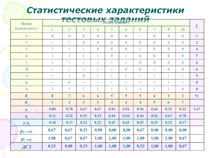 где pj и qj – доля правильных и неправильных ответов в каждом задании;