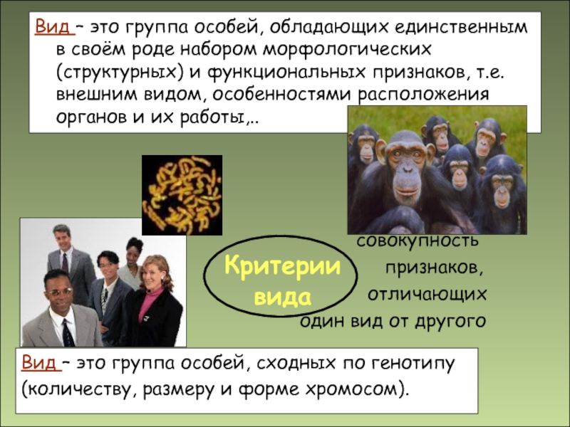 Вид – это группа особей, обладающих единственным в своём роде набором морфологических (структурных) и функциональных признаков, т.е. внешним видом, особенностями расположения органов и их работы,..