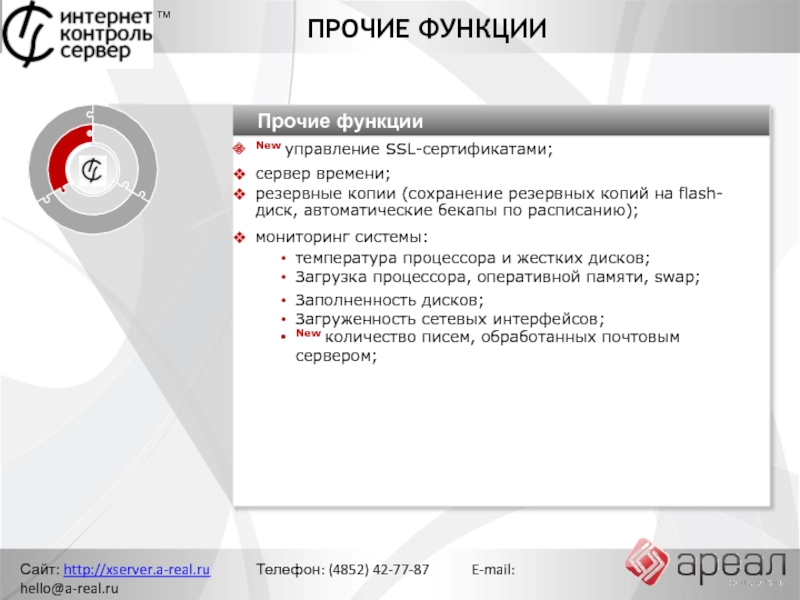 Веб-интерфейс, автоматические бекапы, журнал всех событий системы, мониторинг системы, перехват ICQ сообщений и почты