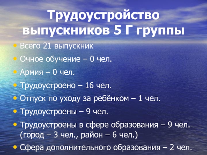 Трудоустроены в сфере образования – 5 чел. (город – 4 чел., район – 1 чел.)