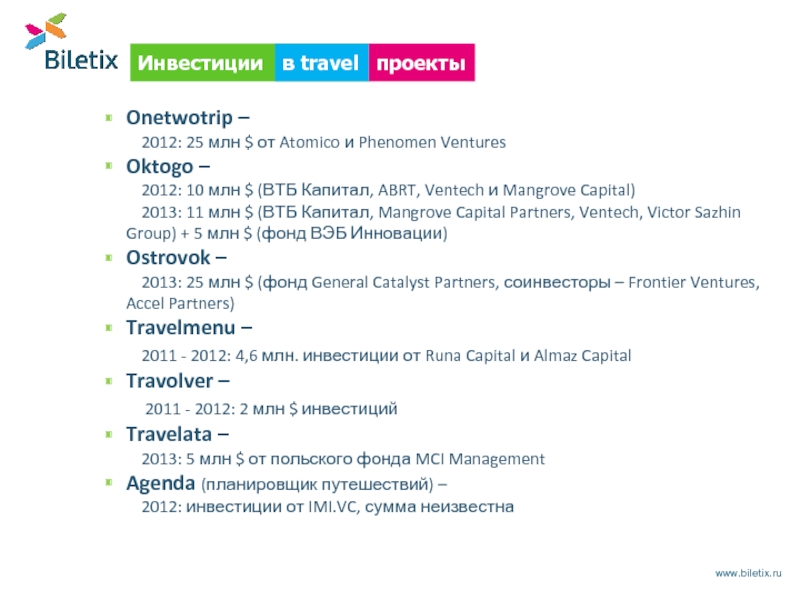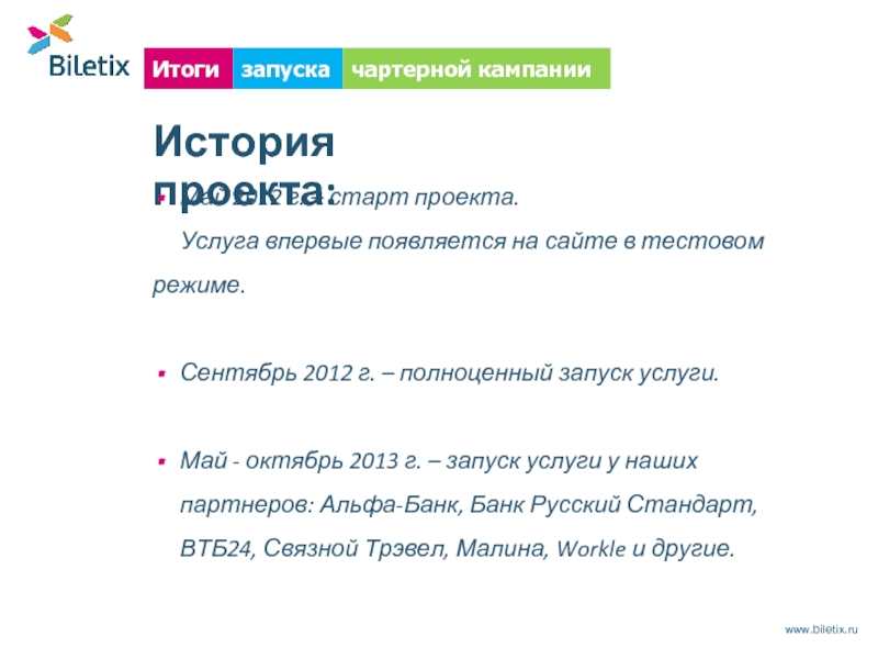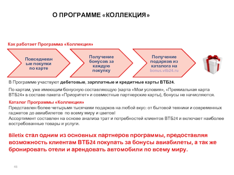 Biletix стал одним из основных партнеров программы, предоставляя возможность клиентам ВТБ24 покупать за бонусы авиабилеты, а так же бронировать отели и арендовать автомобили по всему миру.