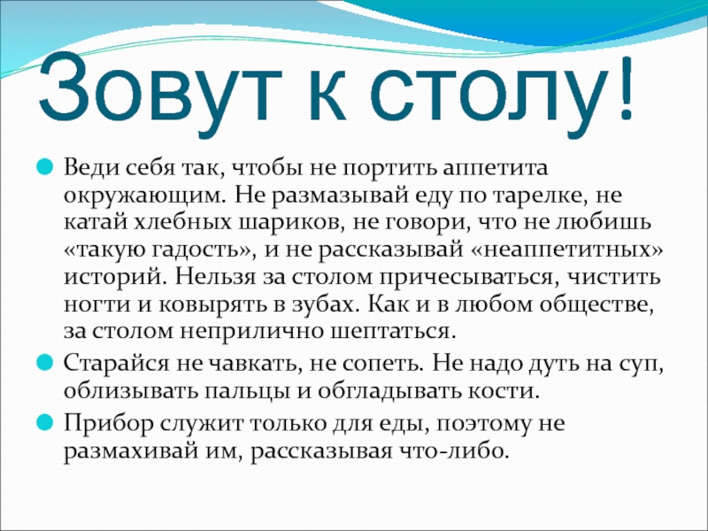 Старайся не чавкать, не сопеть. Не надо дуть на суп, облизывать пальцы и обгладывать кости.
