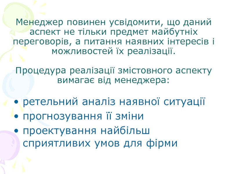 Слайд 8Менеджер повинен усвідомити, що даний аспект не тільки предмет майбутніх переговорів,
