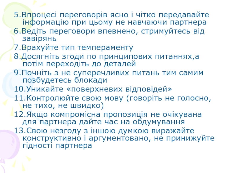 5.Впроцесі переговорів ясно і чітко передавайте інформацію при цьому не навчаючи