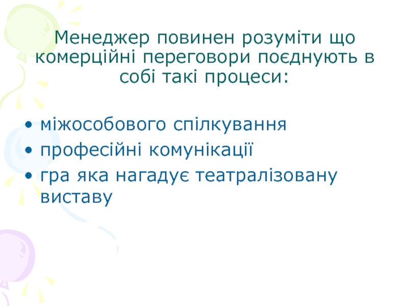 Слайд 12Менеджер повинен розуміти що комерційні переговори поєднують в собі такі процеси: