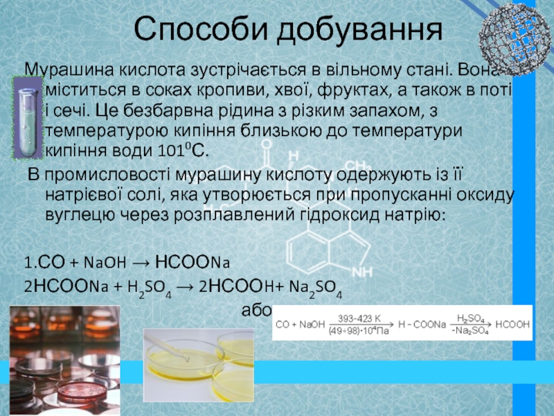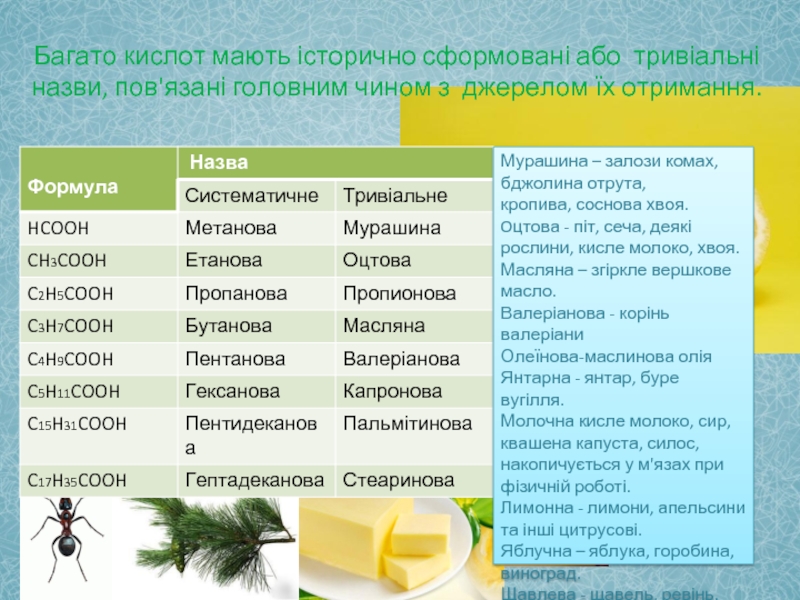 Oцтова - піт, сеча, деякі рослини, кисле молоко, хвоя.