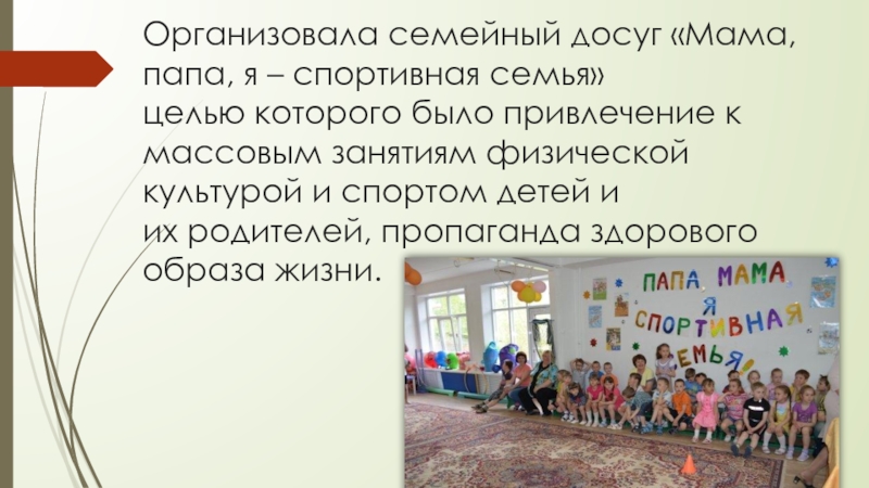 Слайд 8Организовала семейный досуг «Мама, папа, я – спортивная семья»