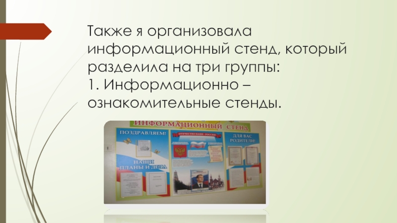 Слайд 5Также я организовала информационный стенд, который разделила на три группы:
