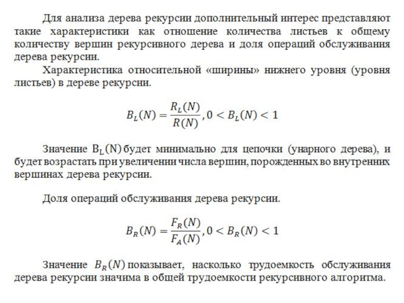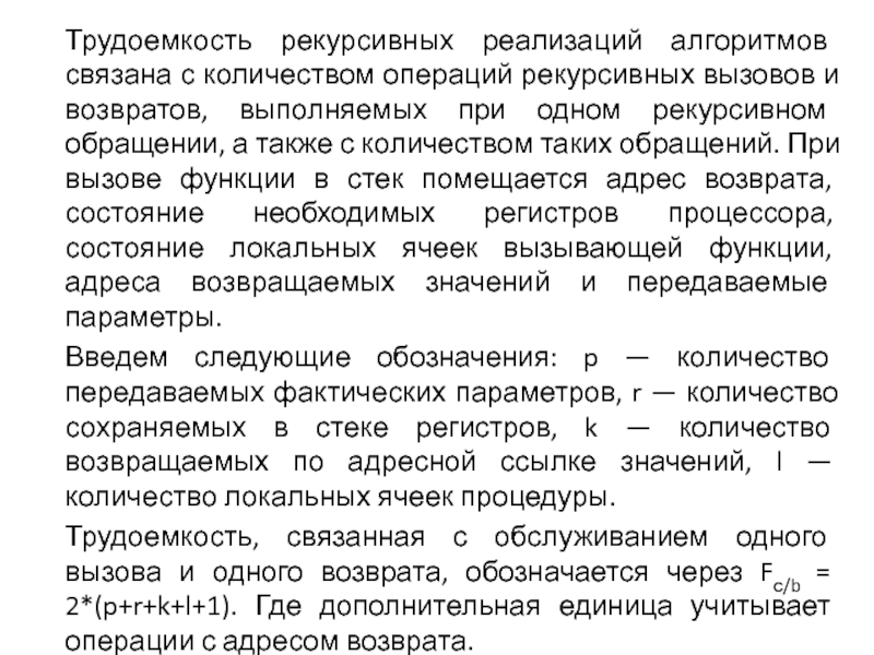Слайд 8Трудоемкость рекурсивных реализаций алгоритмов связана с количеством операций рекурсивных вызовов и