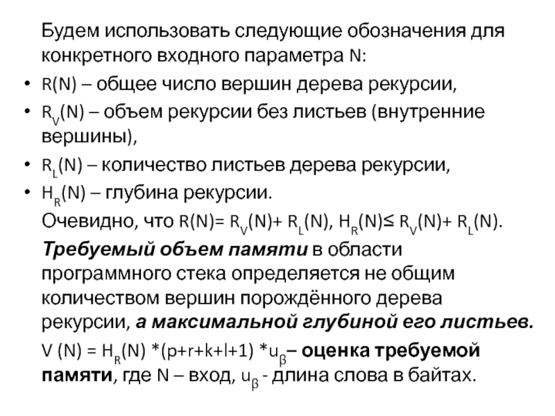 Слайд 12Для построения ресурсных функций рекурсивных алгоритмов необходимо учесть ряд особенностей рекурсивной