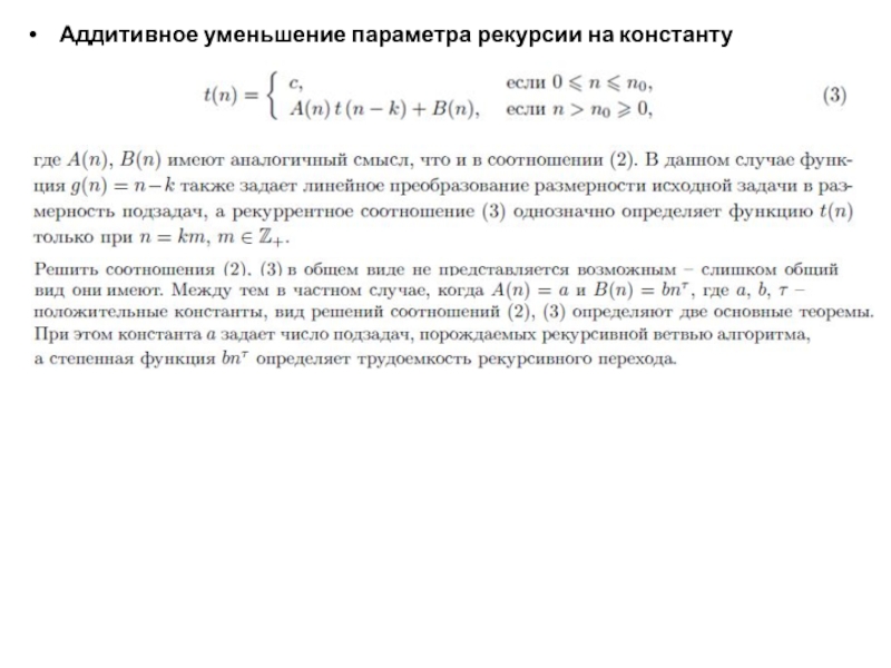 Слайд 3Аддитивное уменьшение параметра рекурсии на константу
