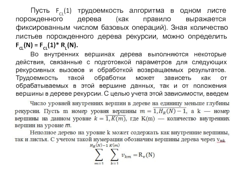 Слайд 14 Пусть FCL(1) трудоемкость алгоритма в одном листе порожденного дерева (как правило