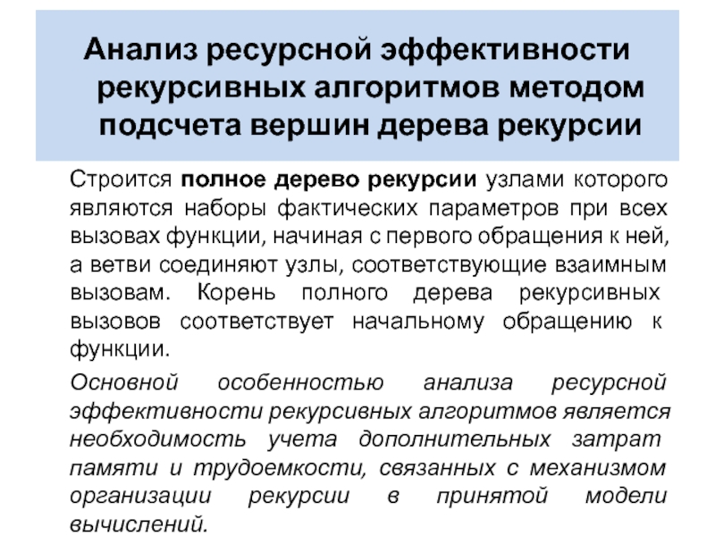 Основной особенностью анализа ресурсной эффективности рекурсивных алгоритмов является необходимость учета дополнительных затрат памяти и трудоемкости, связанных с механизмом организации рекурсии в принятой модели вычислений.