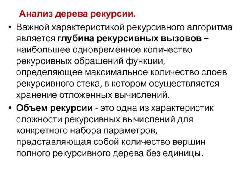 Важной характеристикой рекурсивного алгоритма является глубина рекурсивных вызовов –