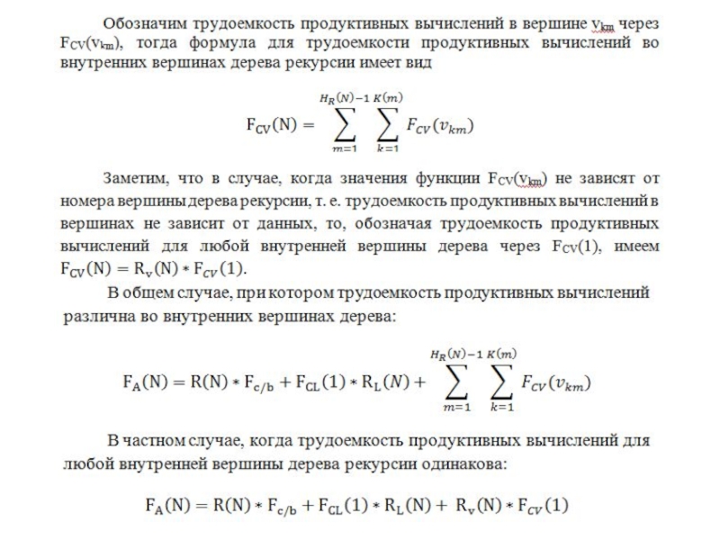 Пусть FCV(N) — трудоемкость продуктивных вычислений (обработки данных) во внутренних вершинах, FCL(N) — трудоемкость вычислений в листьях дерева рекурсии, тогда FC(N) = FCV(N) + FCL(N).