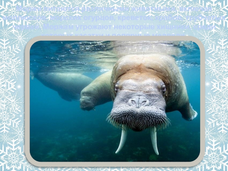 червей. Моржам угрожают некоторые хищники, среди которых касатки и полярные медведи.