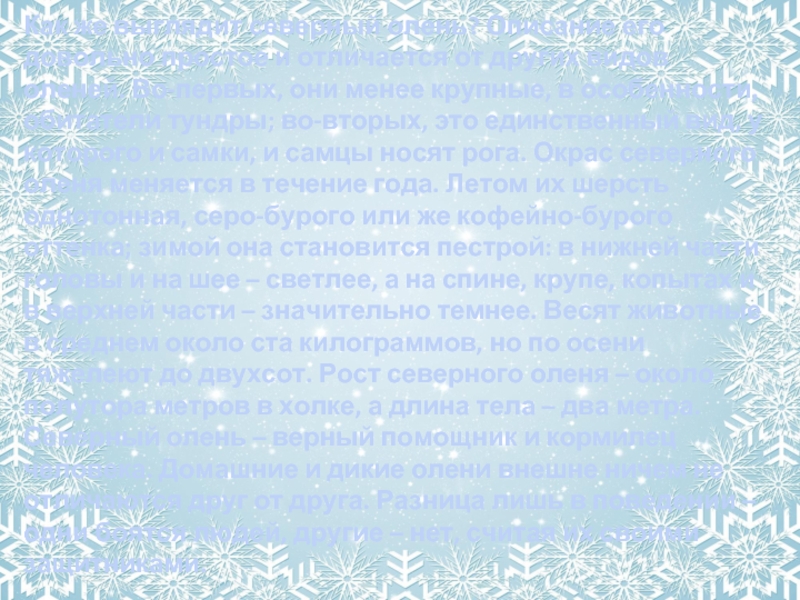 от других видов оленей. Во-первых, они менее крупные, в особенности, обитатели тундры; во-вторых, это единственный вид, у которого и самки, и самцы носят рога. Окрас северного оленя меняется в течение года. Летом их шерсть однотонная, серо-бурого или же кофейно-бурого оттенка; зимой она становится пестрой: в нижней части головы и на шее – светлее, а на спине, крупе, копытах и в верхней части – значительно темнее. Весят животные в среднем около ста килограммов, но по осени тяжелеют до двухсот. Рост северного оленя – около полутора метров в холке, а длина тела – два метра.