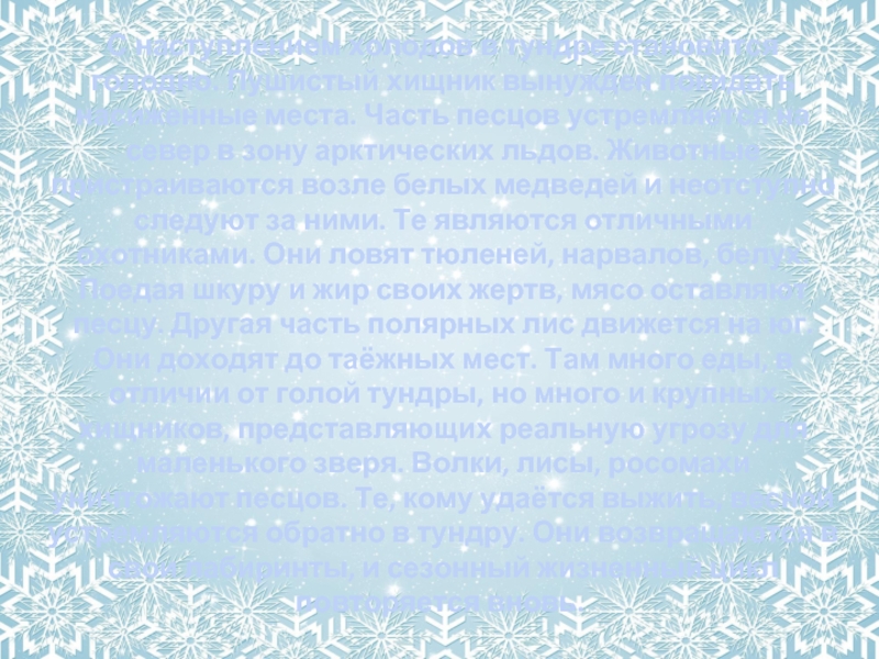 Слайд 16С наступлением холодов в тундре становится голодно. Пушистый хищник вынужден покидать