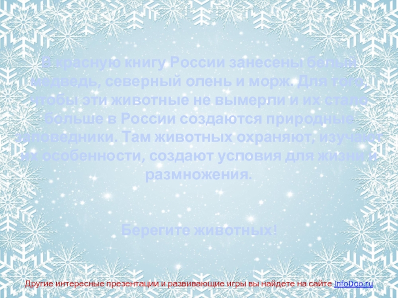 Слайд 20В красную книгу России занесены белый медведь, северный олень и морж.