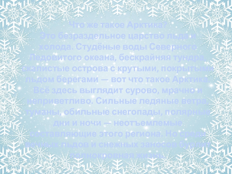 воды Северного Ледовитого океана, бескрайняя тундра, скалистые острова с крутыми, покрытыми льдом берегами — вот что такое Арктика. Всё здесь выглядит сурово, мрачно и неприветливо. Сильные ледяные ветра, туманы, обильные снегопады, полярные дни и ночи — неотъемлемые составляющие этого региона. Но среди вечных льдов и снежных заносов бурлит полнокровная жизнь.