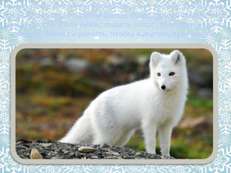 всех псовых, остротой не отличается. Морда укороченная, тело приземистое. Если нужно подать голос, то полярная лиса тявкает. Может и рычать, чтобы напугать противника.