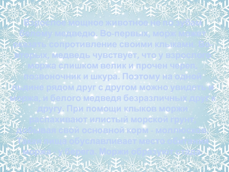 оказать сопротивление своими клыками. Во-вторых, медведь чувствует, что у взрослого моржа слишком велик и прочен череп, позвоночник и шкура. Поэтому на одной льдине рядом друг с другом можно увидеть и моржа, и белого медведя безразличных друг к другу. При помощи клыков моржи распахивают илистый морской грунт, добывая свой основной корм - моллюсков. Такая пища обуславливает место обитания моржа - у берега. Моржи образуют стада.