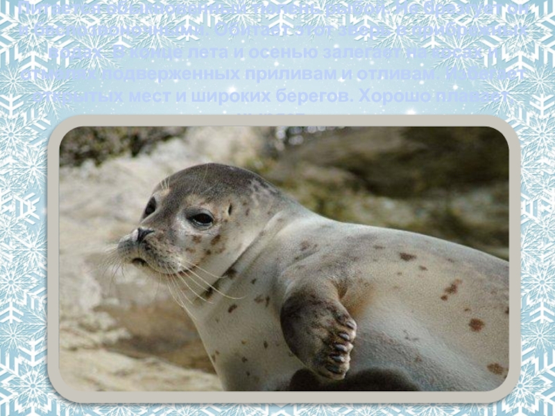 Слайд 12Питается обыкновенный тюлень рыбой. Не брезгует он и беспозвоночными. Обитает этот
