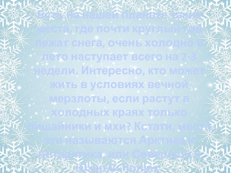 снега, очень холодно и лето наступает всего на 2-3 недели. Интересно, кто может жить в условиях вечной мерзлоты, если растут в холодных краях только лишайники и мхи? Кстати, места эти называются Арктика и Антарктика, или Северный и Южный полюс.