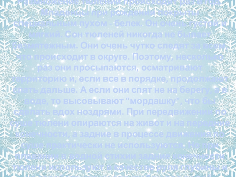 пухом - белек. Он очень густой и мягкий. Сон тюленей никогда не бывает безмятежным. Они очень чутко следят за всем, что происходит в округе. Поэтому, несколько раз они просыпаются, осматривают территорию и, если все в порядке, продолжают спать дальше. А если они спят не на берегу, а в воде, то высовывают "мордашку", что бы сделать вдох ноздрями. При передвижении по суше тюлени опираются на живот и на передние конечности, а задние в процессе движения по суше практически не используются. Но при плавании в водной стихии задние конечности тюлени используют в качестве руля глубины и не задействуют их для гребли под водой.