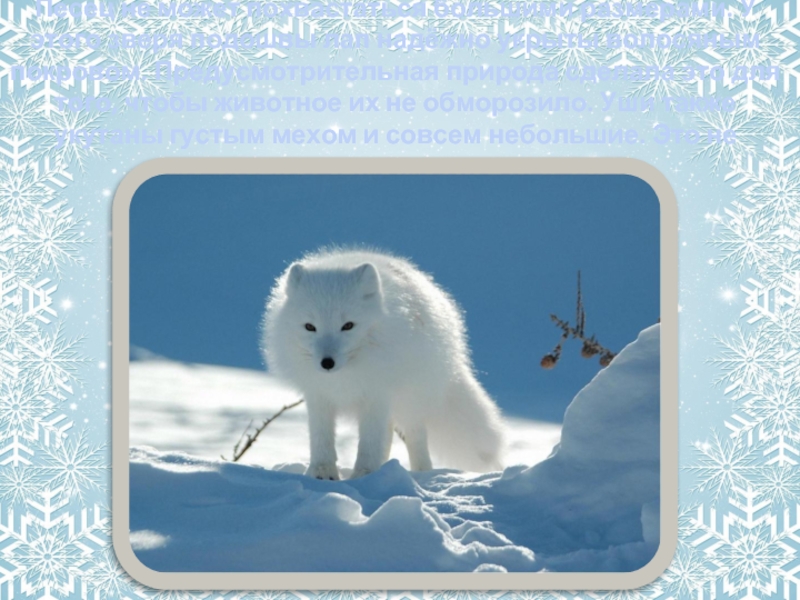 надёжно укрыты волосяным покровом. Предусмотрительная природа сделала это для того, чтобы животное их не обморозило. Уши также укутаны густым мехом и совсем небольшие. Это не мешает песцу прекрасно слышать.