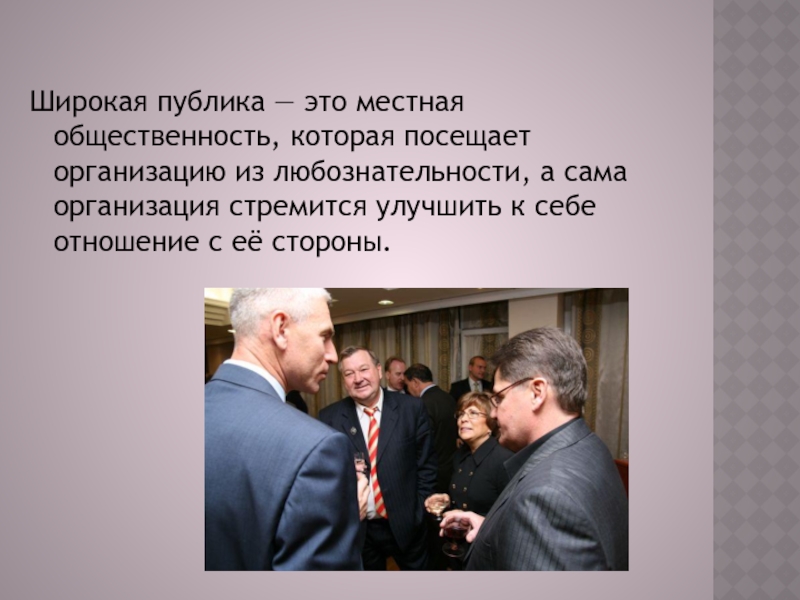 Широкая публика — это местная общественность, которая посещает организацию из любознательности,