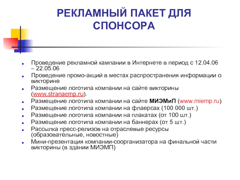 Слайд 7РЕКЛАМНЫЙ ПАКЕТ ДЛЯ СПОНСОРА