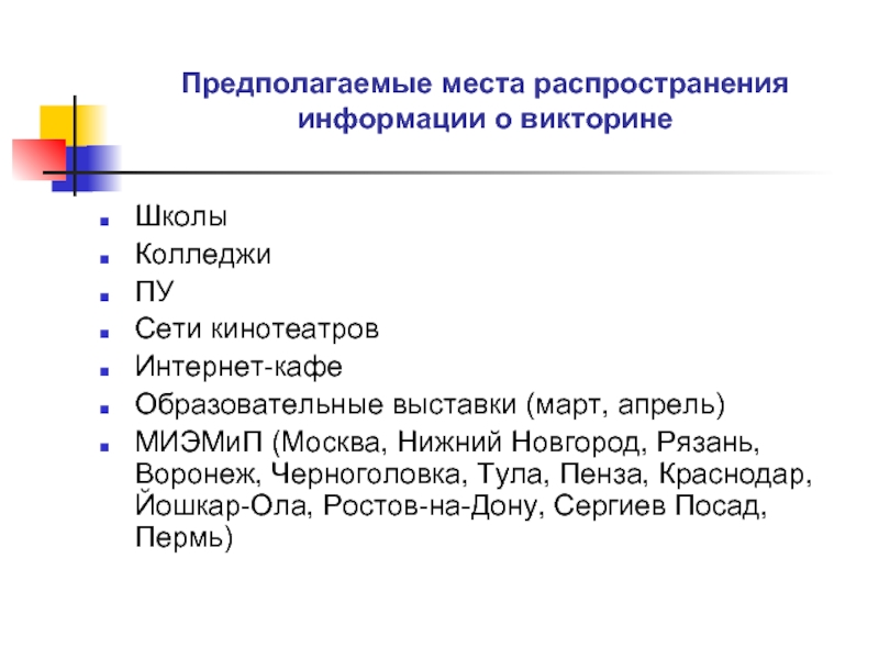 (Москва, Нижний Новгород, Рязань, Воронеж, Черноголовка, Тула, Пенза, Краснодар, Йошкар-Ола, Ростов-на-Дону, Сергиев Посад, Пермь)