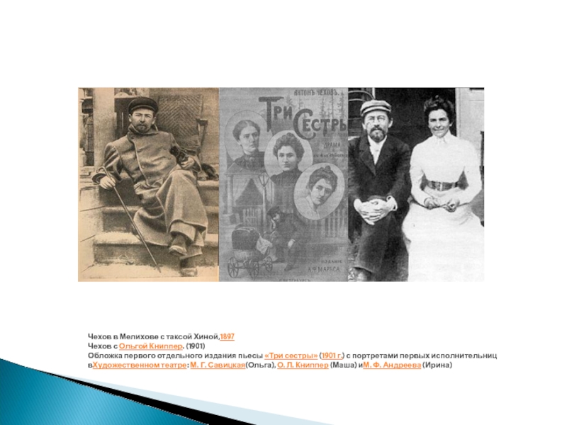 издания пьесы «Три сестры» (1901 г.) с портретами первых исполнительниц вХудожественном театре: М. Г. Савицкая(Ольга), О. Л. Книппер (Маша) иМ. Ф. Андреева (Ирина)