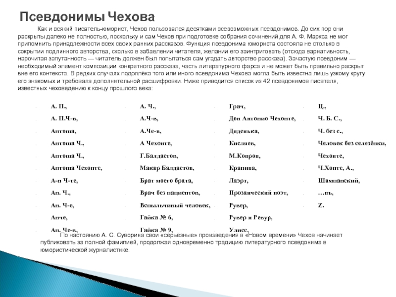 они раскрыты далеко не полностью, поскольку и сам Чехов при подготовке собрания сочинений для А. Ф. Маркса не мог припомнить принадлежности всех своих ранних рассказов. Функция псевдонима юмориста состояла не столько в сокрытии подлинного авторства, сколько в забавлении читателя, желании его заинтриговать (отсюда вариативность, нарочитая запутанность — читатель должен был попытаться сам угадать авторство рассказа). Зачастую псевдоним — необходимый элемент композиции конкретного рассказа, часть литературного фарса и не может быть правильно раскрыт вне его контекста. В редких случаях подоплёка того или иного псевдонима Чехова могла быть известна лишь узкому кругу его знакомых и требовала дополнительной расшифровки. Ниже приводится список из 42 псевдонимов писателя, известных чеховедению к концу прошлого века: