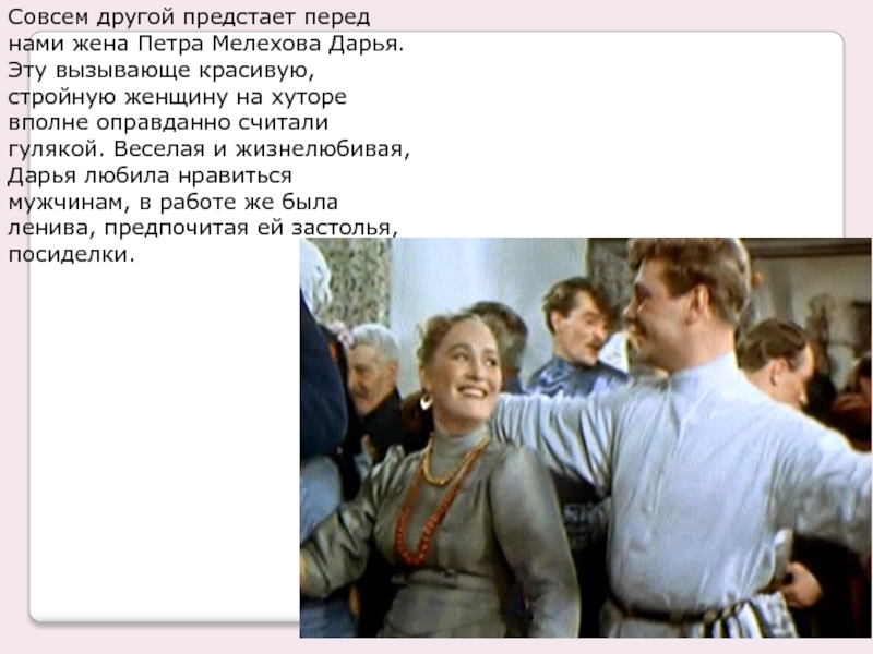 Слайд 13Совсем другой предстает перед нами жена Петра Мелехова Дарья. Эту вызывающе