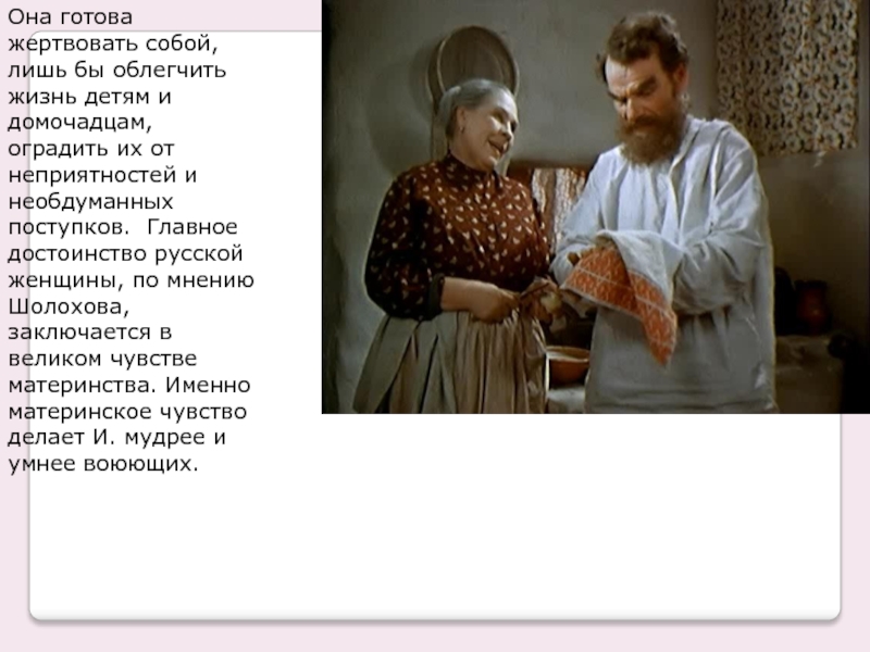 оградить их от неприятностей и необдуманных поступков. Главное достоинство русской женщины, по мнению Шолохова, заключается в великом чувстве материнства. Именно материнское чувство делает И. мудрее и умнее воюющих.