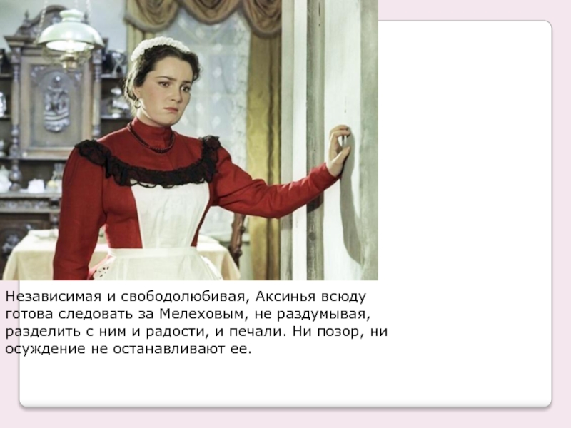 Слайд 10Независимая и свободолюбивая, Аксинья всюду готова следовать за Мелеховым, не раздумывая,