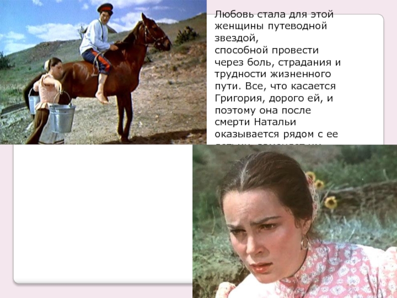 страдания и трудности жизненного пути. Все, что касается Григория, дорого ей, и поэтому она после смерти Натальи оказывается рядом с ее детьми, заменяет им мать.