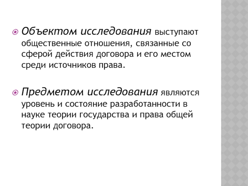 Слайд 5Объектом исследования выступают общественные отношения, связанные со сферой действия договора и