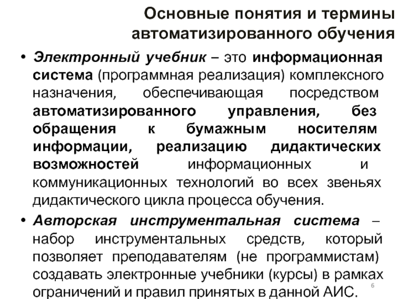 Слайд 6Электронный учебник – это информационная система (программная реализация) комплексного назначения, обеспечивающая