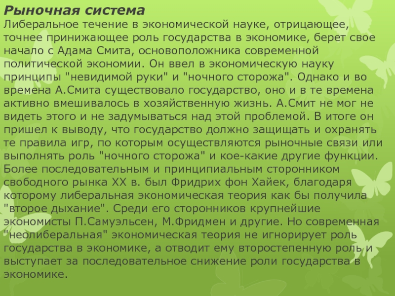 в экономике, берет свое начало с Адама Смита, основоположника современной политической экономии. Он ввел в экономическую науку принципы "невидимой руки" и "ночного сторожа". Однако и во времена А.Смита существовало государство, оно и в те времена активно вмешивалось в хозяйственную жизнь. А.Смит не мог не видеть этого и не задумываться над этой проблемой. В итоге он пришел к выводу, что государство должно защищать и охранять те правила игр, по которым осуществляются рыночные связи или выполнять роль "ночного сторожа" и кое-какие другие функции. Более последовательным и принципиальным сторонником свободного рынка XX в. был Фридрих фон Хайек, благодаря которому либеральная экономическая теория как бы получила "второе дыхание". Среди его сторонников крупнейшие экономисты П.Самуэльсен, М.Фридмен и другие. Но современная "неолиберальная" экономическая теория не игнорирует роль государства в экономике, а отводит ему второстепенную роль и выступает за последовательное снижение роли государства в экономике.
