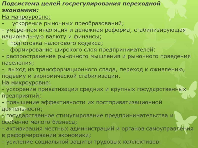 Слайд 11Подсистема целей госрегулирования переходной экономики: