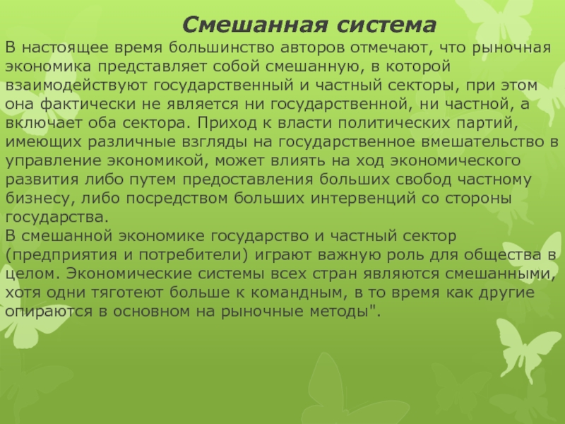 В смешанной экономике государство и частный сектор (предприятия и потребители) играют важную роль для общества в целом. Экономические системы всех стран являются смешанными, хотя одни тяготеют больше к командным, в то время как другие опираются в основном на рыночные методы".