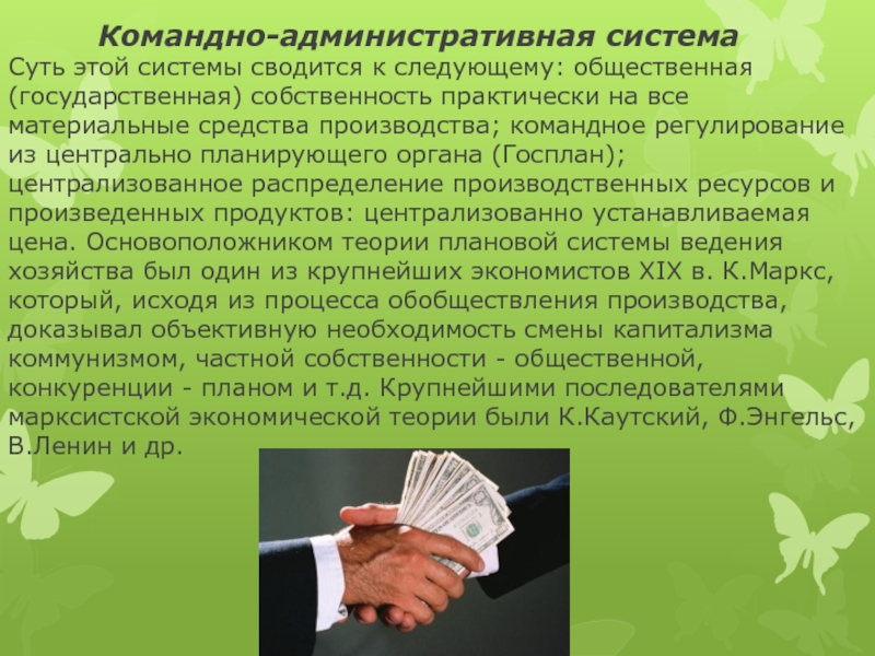 следующему: общественная (государственная) собственность практически на все материальные средства производства; командное регулирование из центрально планирующего органа (Госплан); централизованное распределение производственных ресурсов и произведенных продуктов: централизованно устанавливаемая цена. Основоположником теории плановой системы ведения хозяйства был один из крупнейших экономистов XIX в. К.Маркс, который, исходя из процесса обобществления производства, доказывал объективную необходимость смены капитализма коммунизмом, частной собственности - общественной, конкуренции - планом и т.д. Крупнейшими последователями марксистской экономической теории были К.Каутский, Ф.Энгельс, В.Ленин и др.