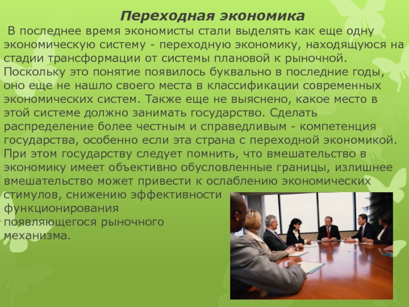 В последнее время экономисты стали выделять как еще одну экономическую систему - переходную экономику, находящуюся на стадии трансформации от системы плановой к рыночной. Поскольку это понятие появилось буквально в последние годы, оно еще не нашло своего места в классификации современных экономических систем. Также еще не выяснено, какое место в этой системе должно занимать государство. Сделать распределение более честным и справедливым - компетенция государства, особенно если эта страна с переходной экономикой. При этом государству следует помнить, что вмешательство в экономику имеет объективно обусловленные границы, излишнее вмешательство может привести к ослаблению экономических стимулов, снижению эффективности