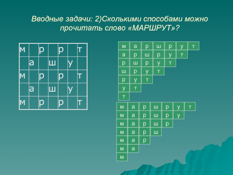 Слайд 3Вводные задачи: 2)Сколькими способами можно прочитать слово «МАРШРУТ»?