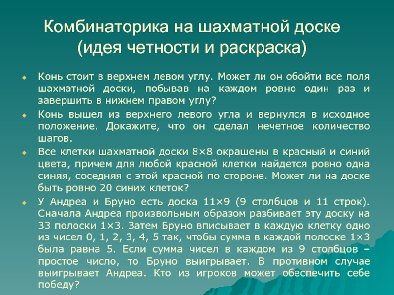 Слайд 20Комбинаторика на шахматной доске (идея четности и раскраска)
